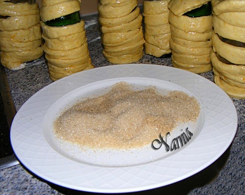 Dupa ce le-am infasurat pe toate, le-am uns cu ulei pe deasupra si le-am tavalit intr-un amestec de zahar de trestie ( e bun orice zahar mai mare) amestecat cu vanilie praf.